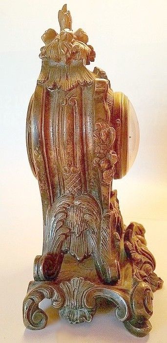 Belle pendule de forme violonée, richement ornée de volutes, feuillages et feuilles godronnées avec, sur les côtés, des bouquets de fleurs ajourés. Le piétement du socle est formé par quatre pieds en sabot feuillagés. Cadran émaillé blanc à chiffres romains pour les heures et arabes pour les minutes. En état de fonctionnement