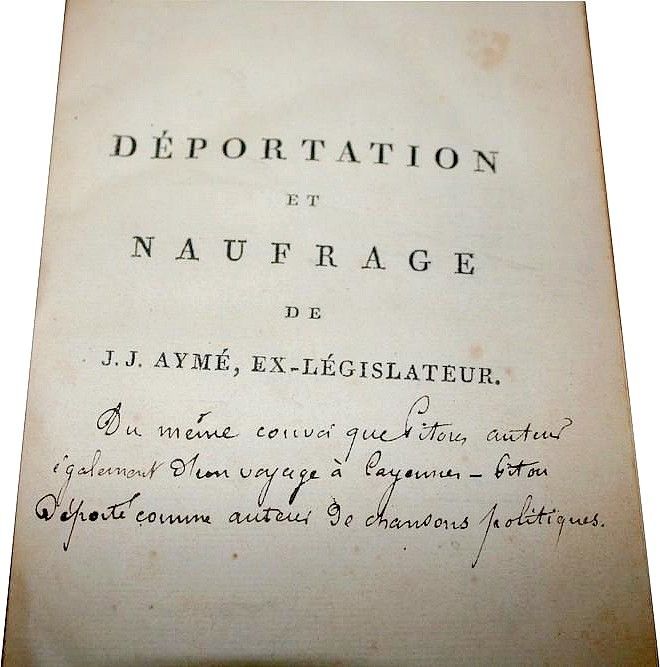 Déportation et naufrage de J.J. Aymé, ex-législateur, suivis du tableau de vie et de mort des déportés à son départ de la Guyane, avec quelques observations sur cette colonie et sur les nègres. Journal de l'Adjudant Général Ramel...l'un des Déportés A, Paris Chez MARADAN, s.d. & Londres, 1799 2 livres reliés en 1. In-8, 269 pp.+ 24 pp pour le tableau de la liste alphabetique des déportés embarqués sur la corvette. In-8 2ff. IV. 174pp. 11pp Reliure fin XIX ème , demi-maroquin bleu marine, dos à nerf, caissons dorés à motifs. Tranche supérieure dorée. Année d’édition - R 38917