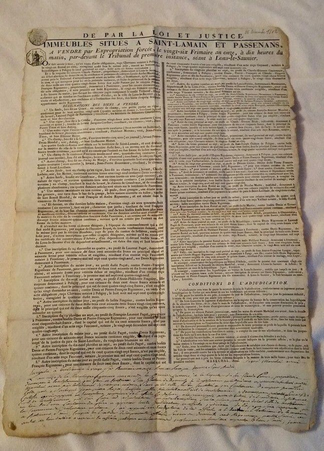 Affiche de vente par expropriation forcée a Saint-Lamain et Passenans le 26 frimaire an onze.
