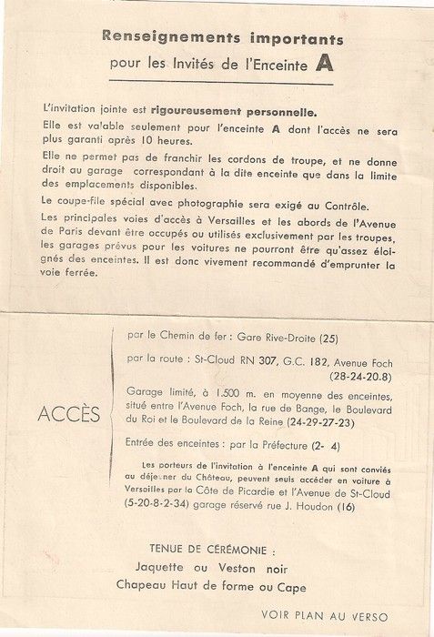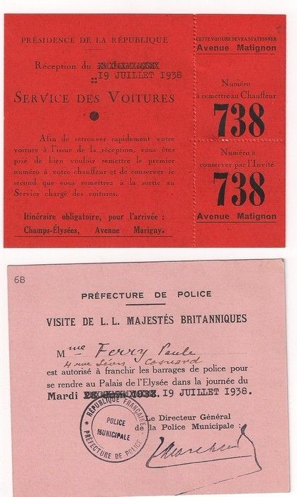 Voyage officiel de L.L. M.M le Roi et la Reine de Grande Bretagne 1938 - lot de 7 documents comprenant : Deux Laissez- passer, Une autorisation de franchir les barrages, Une invitation pour assister au défilé militaire, une invitation du Président de la République Albert LEBRUN , Un plan et une autorisation de stationner.