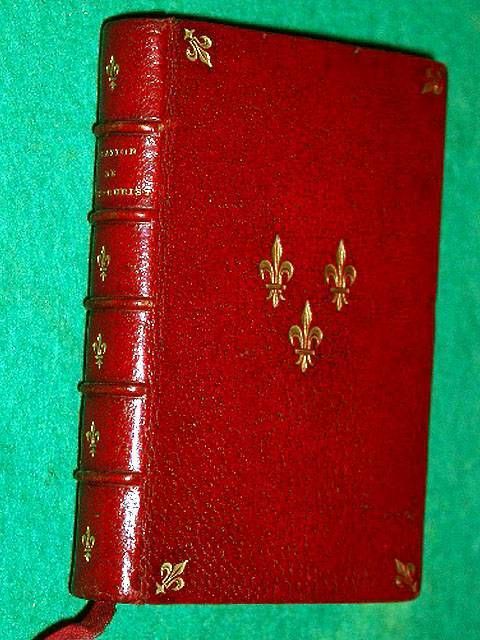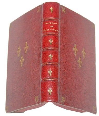 Tours, Mame, 1868 reliure plein maroquin rouge signée Ch. de HAAS, plats ornésau centre et dans les coins de de fleurs de lys, dos à 5 nerfs, entre-nerfs ornés de fleurs de lys, gardes décorées de dentelles, toutes tranches rouges à semis de fleurs de lys dorées.