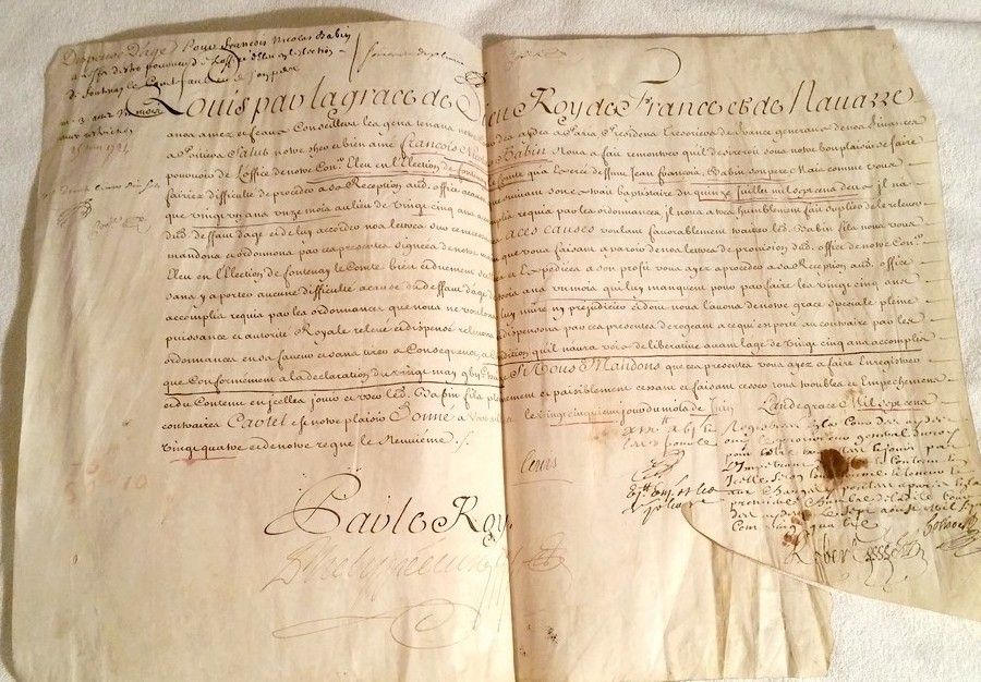 DISPENSE D'AGE. Manuscrit sur parchemin signé "Louis" (secrétaire), contresigné Philippeaux, comme Conseiller, secrétaire d'État, fait à Versailles, le 25 juin 1724. DISPENSE D'AGE pour Francois Nicolas BABIN conseiller du roi, élu en l'élection de Fontenay...
