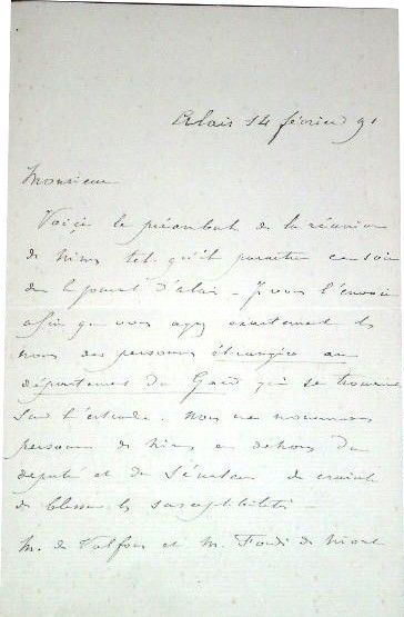 Lettre autographedu baron de Roux-Larcy adressée à M. de Frechencourt cette lettre lui annonce le préambule d'une réunion à Nîmes tel qu'il paraîtra dans le journal d'Alai et il demande d'enlever des noms parus dans la Gazette de France, etc. 14 février...