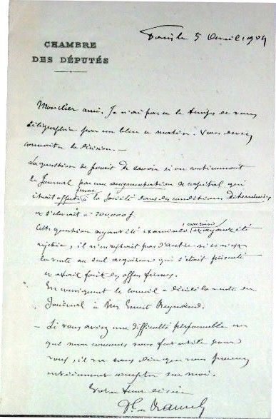 Lettre autographe à entête de la Chambre des Députés du Comte de RAMEL Augustin adressée à M. De FRECHENCOURT, Il annonce que le conseil à décidé de vendre le journal à M. Ernest Reynaud, Etc.. Le 5 avril 1904 Une page - DEPUTE du Gard.Né le 27 mars 1847...