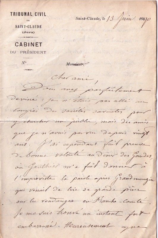 Intéressante lettre autographe signée de l'historien Charles-Émilien Thuriet, adressée à Léonce PINGAUD, historien (Dijon, 1841 - Ornans, 1923). Au sujet d'une visite au congrès des Stès Savantes pour retrouver des amis. Grandmougin a pris la parole pour...