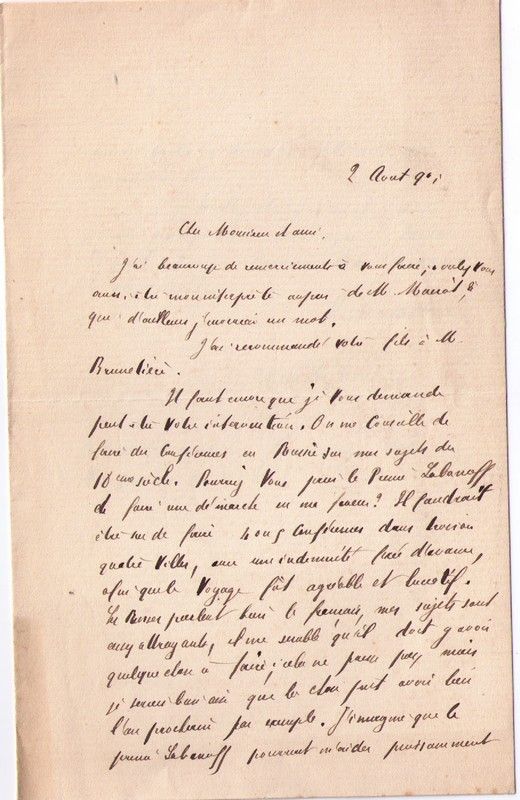 Lettre autographe signée de l' historien et écrivain Victor Du Bled adressée à Léonce PINGAUD, historien (Dijon, 1841 - Ornans. Au sujet de 3 ou 4 conférences en Russie sur des sujets du 18ème siècle. Il demande l’intervention de Pingaud et du Prince...